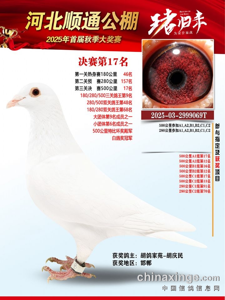 河北顺通公棚2025年首届秋季大奖赛圆满落幕,虽为首届办赛,赛事含金量依旧十足。本届设三关正赛,依次为180公里第一关、280公里第二关、500公里第三。万羽角逐中,一羽白衣如雪、气宇轩昂的大将惊艳全场!此鸽出自胡鸽家苑-胡庆民麾下,环号2025032999069T,通体素白如云。此鸽首关180公里以第46名强势亮相,次关280公里稳守第157名,及至终极500公里决战,冲刺至第17名。三关成绩均衡稳健,最终荣耀加冕三关鸽王第九名,同时为主人赢下丰厚大奖。