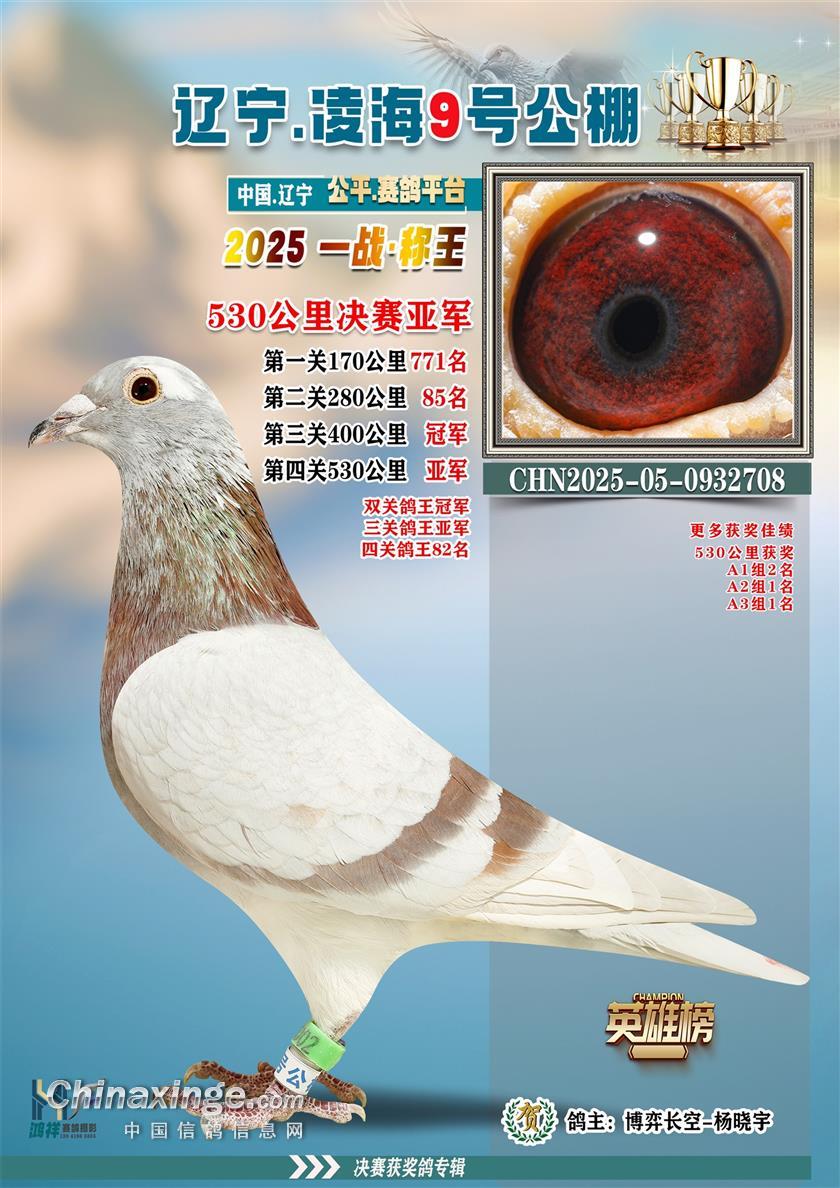 辽西大地,风云再起!辽宁锦州凌海9号公棚2025年第四届秋赛,以新式、愉快、公平、公开,构建竞翔良好氛围。本届设四关正赛:170公里首关、280公里二关、400公里三关、530公里终极决赛。在轮番高强度淬炼之中,一羽绛花所向披靡飒爽无比,它出自博弈长空-杨晓宇名下,环号05-0932708。此鸽首关位列771名、二关位列第85名、三关勇夺冠军,至530公里终极决战,仍以钢铁意志拿下亚军,一举包揽双关鸽王冠军与三关鸽王亚军两项荣誉,实力惊人。