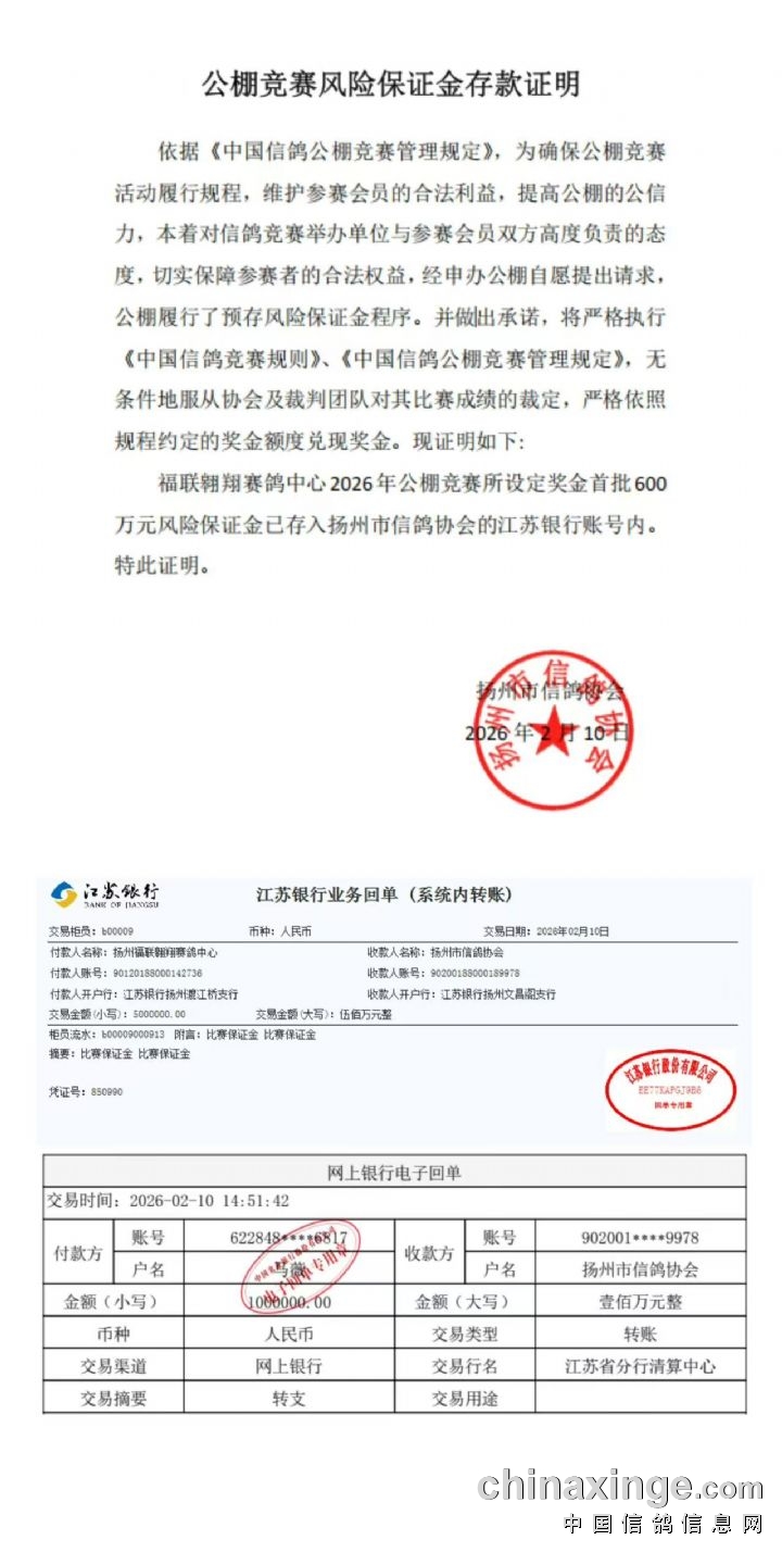 面对那些公棚的不良状况和过去不良赛事的负面影响,2026年扬州福联翱翔赛鸽公棚率先协同扬州市信鸽协会共同商议、举措2026年公棚信鸽春棚赛事,并在收费站集鸽放飞前将赛事风险保证金600万元直接汇入扬州市信鸽协会户名账户,改变了过去户名账号及资金到位不严谨、监管虚设不到位、赛事风险保证金只存入公棚老板私人户名账号的弊端,从真正意义上起到了相互监督、相互制约、相互管理的三管作用,为赛事规范举办奠定了坚实基础。