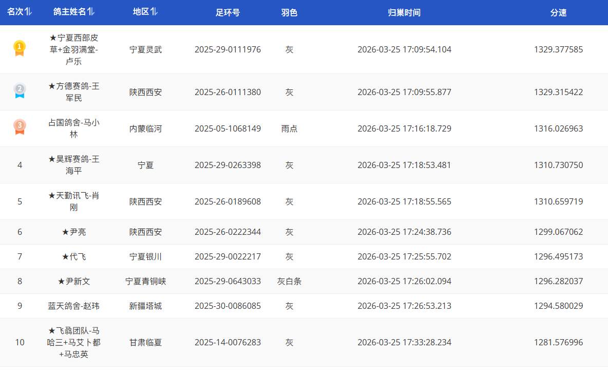 17时44分47秒,领翔赛鸽俱乐部-陈刚麾下一羽2025-29-0296626灰鸽踩钟报进,分速1222.4742米/分,获得季军。