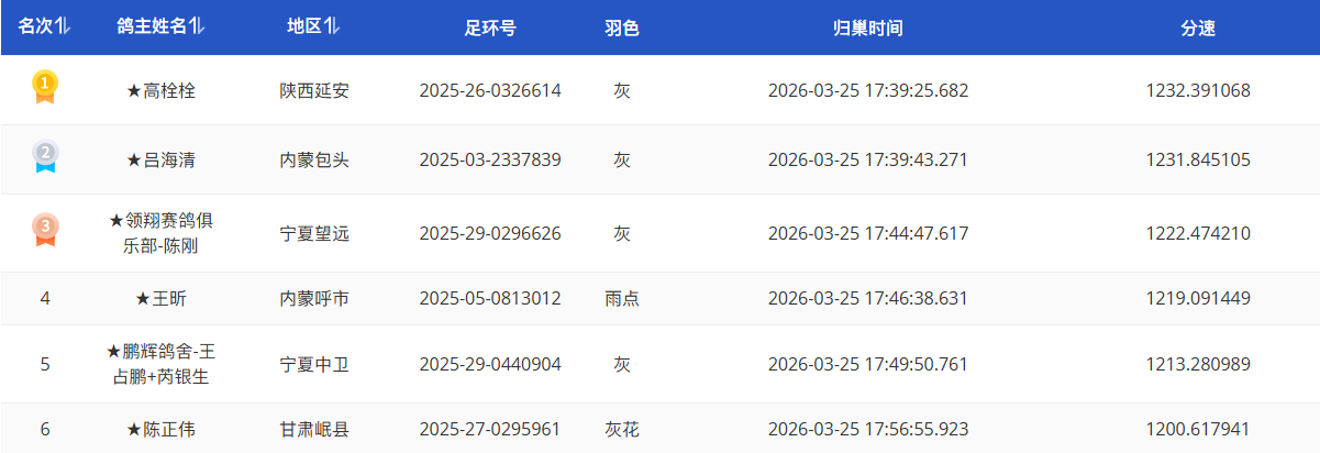 君翼:下午17时39分25秒,鸽友高栓栓麾下2025-26-0326614灰报进,分速1232.3910米/分,获得冠军。