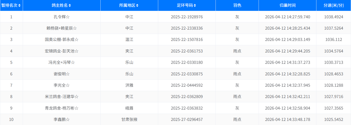 下午14时27分59秒,鸽友孔令辉的一羽2025-22-1928976灰鸽率先归来,分速1038.4924米/分,斩获本次决赛冠军。