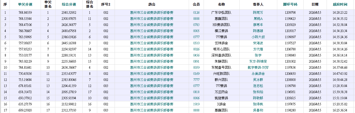 14:32:38,HR赛鸽团队-廖再丰名下1205829赛鸽报进,以768.4710米/分的成绩获得季军。
