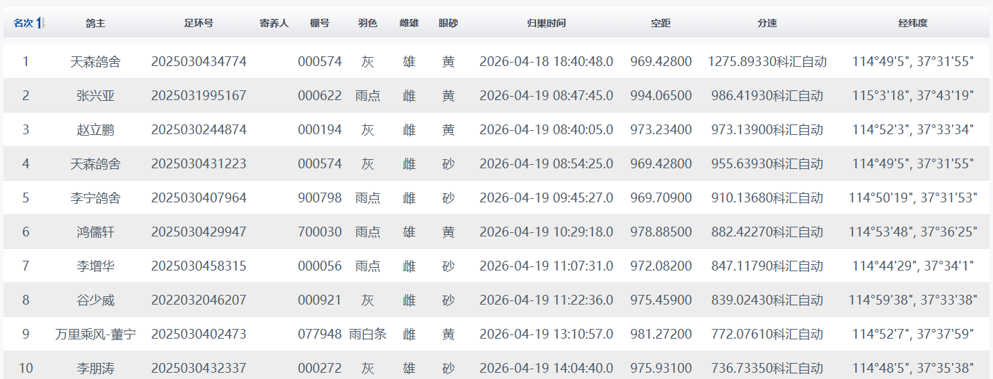 亚军:天森鸽舍的2025-03-0434774赛鸽表现同样出色。这羽黄眼灰雄鸽于当日18:40:48归巢,飞行空距969.428公里,平均分速为1275.8933米/分。