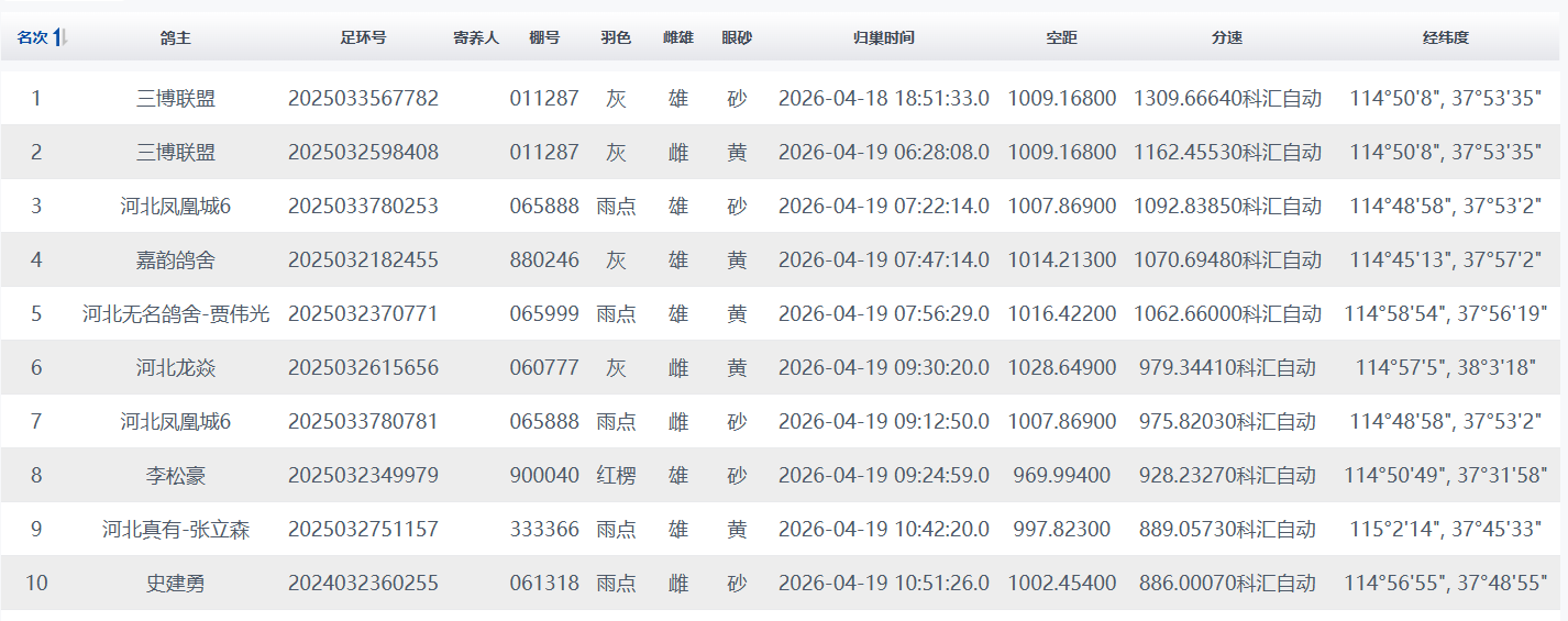 冠军:由三博联盟名下的2025-03-3567782赛鸽斩获。这羽砂眼灰雄鸽不负众望,在飞行了1009.168公里的漫漫征途后,于当日18:51:33顺利归巢,平均分速达1309.6664米/分。