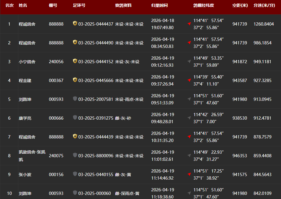 冠军:程诚鸽舍的03-2025-0444437赛鸽表现神勇,于当日19:07:49成功报进,完成941.739公里飞行,平均分速为1260.8404米/分。