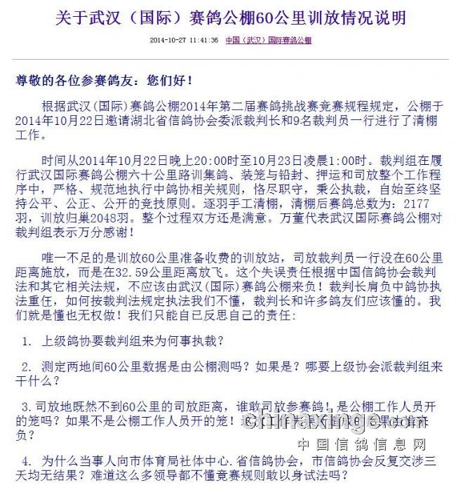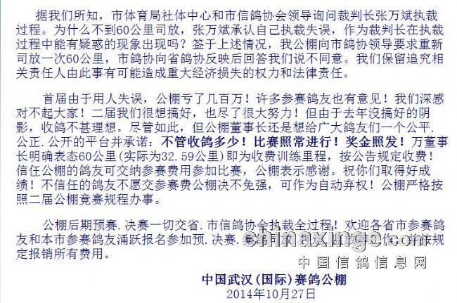 武汉公棚和裁判长双方的公告(图) 在作者今日《老魏开讲》:致武汉国际公棚的视频上传之后,武汉国际公棚在其网站上发表了公告。标题是《关于武汉(国际)赛鸽公棚60公里训放情况说明》,之后,执行裁判长张万斌先生就此也发表了标题为《谎言终归是谎言 代替不了事实》公告。双方各说一词,到底谁是谁非,谁欺骗了谁,请阅读他们双方的公告吧。 武汉公棚的公告