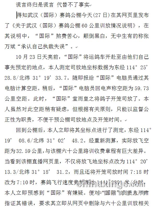 在作者今日《老魏开讲》:致武汉国际公棚的视频上传之后,武汉国际公棚在其网站上发表了公告。标题是《关于武汉(国际)赛鸽公棚60公里训放情况说明》,之后,执行裁判长张万斌先生就此也发表了标题为《谎言终归是谎言 代替不了事实》公告。双方各说一词,到底谁是谁非,谁欺骗了谁,请阅读他们双方的公告吧。