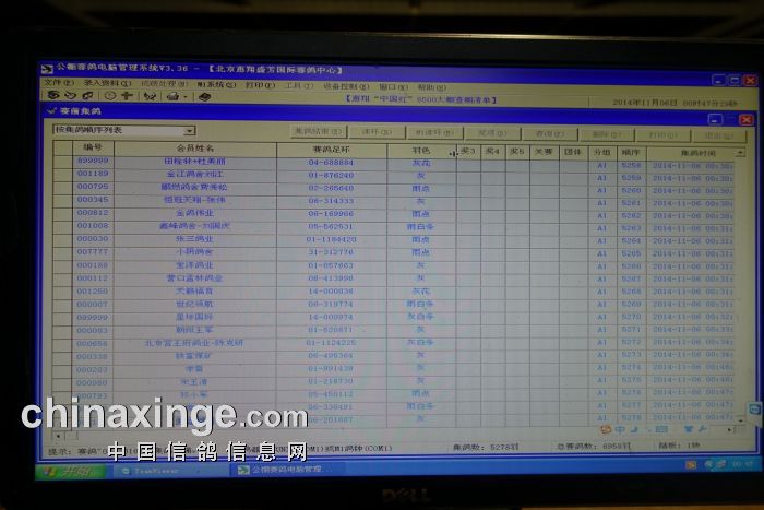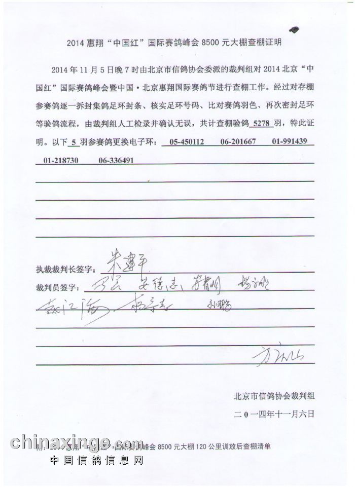 2014年11月5日晚7时由北京市信鸽协会委派的裁判组对2014北京“中国红”国际赛鸽峰会暨中国·北京惠翔国际赛鸽节进行查棚工作。经过对存棚参赛鸽逐一拆封集鸽足环封条、核实足环号码、比对赛鸽羽色、再次密封足环等验鸽流程,由裁判组人工检录并确认无误,共计查棚验鸽5278羽,特此证明。以下5羽参赛鸽更换电子环:05-450112、06-201667、01-991439、01-218730、06-336491。