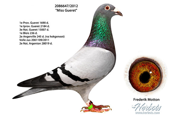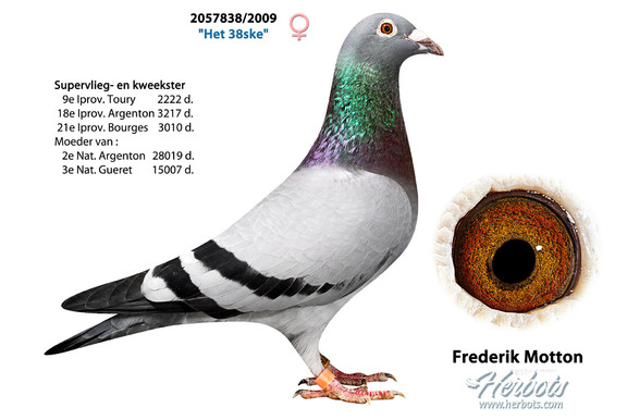 福雷德里克拥有卓越黄金育种配对“年青霍夫肯Jonge Hufkens”(2058016/2009)x“38雌Het 38ske”(2057838/2009)。“年青霍夫肯Jonge Hufkens”没参赛过,直接放到了种鸽舍。“38雌Het 38ske”参赛了2年,因为赛绩卓越被移到了种鸽舍。这个黄金配对是凡阿鸿(Van Avondt)x佛布鲁根(Verbruggen)x已故福洛伦特·马提尼(Florent Materne)的鸽系杂交。福洛伦特·马提尼是福雷德里克的好朋友,对于赛鸽有着非凡的感觉,而福雷德里克从他身上学到了很多。实际上,正是福洛伦特在2010年冬季将这一黄金配对放在了一起。