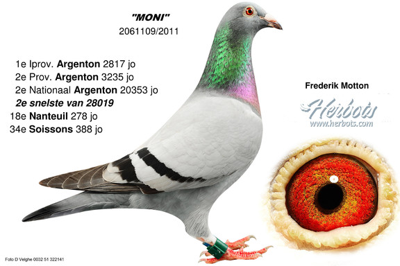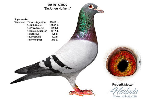 父亲:2058016/2009灰 年青霍夫肯,超级种鸽,亚精顿国家赛幼鸽组28019羽2名以及盖雷国家赛一岁鸽15007羽3名之父