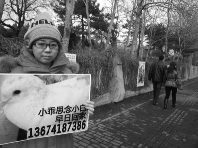 2月14日情人节,街上不少年轻人捧着鲜花走过,记者却在沈阳市皇姑区崇山路上看见一个女孩拿着一张鸽子的图片站在路边,哽咽抽泣。图片上是一只很普通的白鸽,上面写着:“小乖思念小白早日回家!”