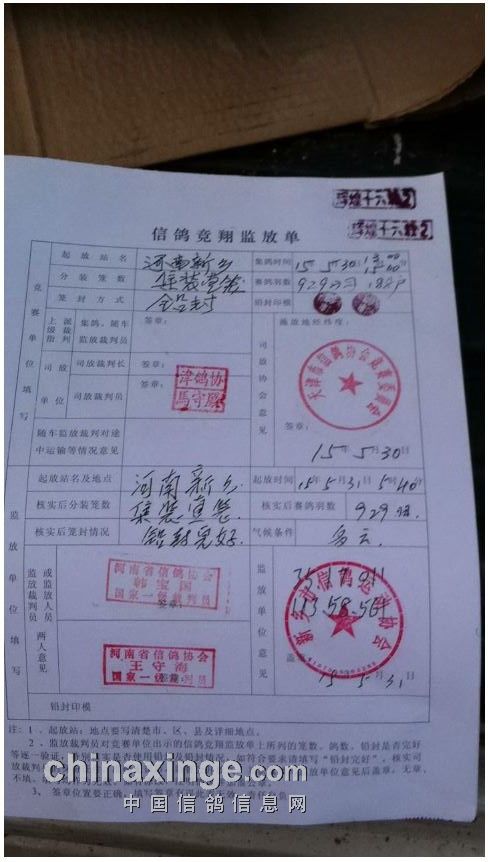 由市精英赛鸽俱乐部举办的天津鸽会第十六届辉煌杯特比环第二关比赛500公里新乡赛,在新乡市信鸽协会监放下,于今早(31日)5:40开笼。司放地天气多云,微风,司放地坐标:E113°58′33.6″/N35°17′0.6″。参赛鸽共计929羽。