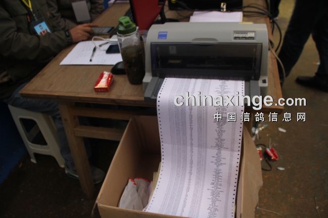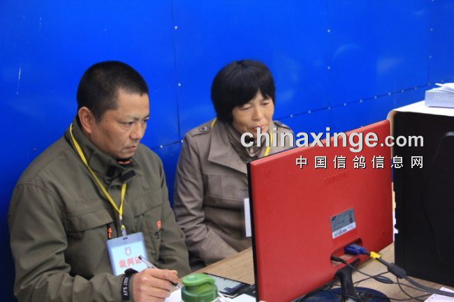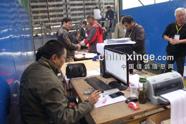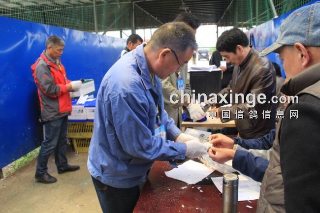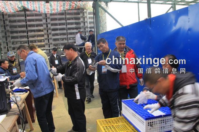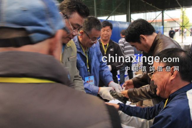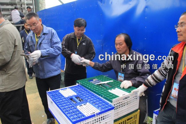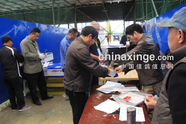 集鸽工作从上午9:30开始,至下午15时结束,裁判员逐羽检查参赛鸽,唱环号,核对鸽子信息,通过电子扫描,实时同步打印,贴一次性密封条,加盖密封暗章,送入鸽笼,处理损坏鸽子足环等等。最后,销毁暗章、加封大笼,发布集鸽公告,总计有效参赛鸽3501羽。