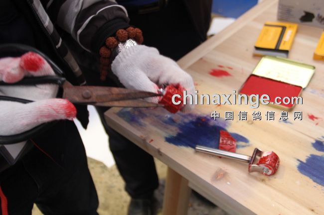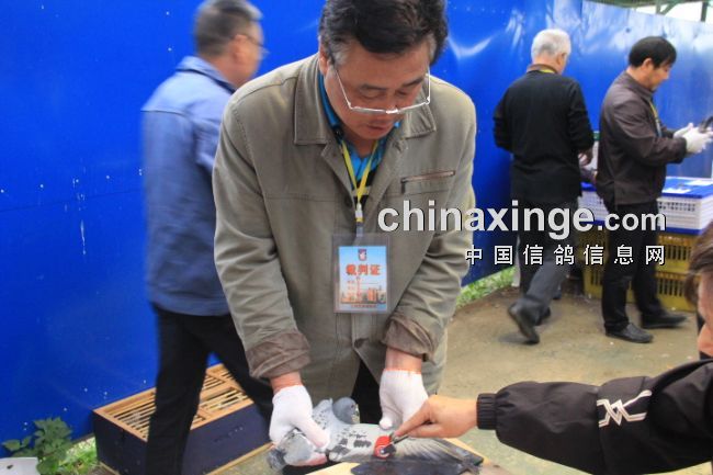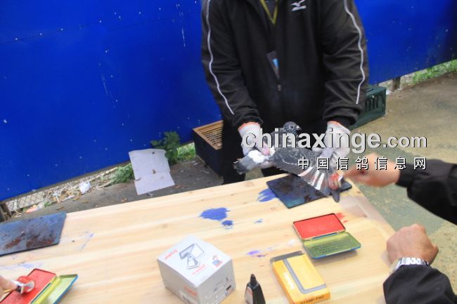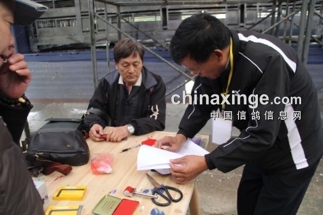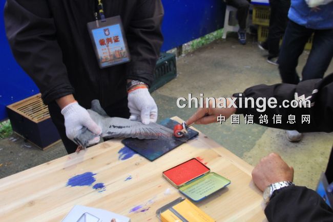 集鸽使用的暗章事先准备了三套,在现场由裁判员随机抽取其中的两套,作为本次集鸽使用,暗章是滚章形式,在每一羽鸽子帮条上印下暗记。另外,裁判员还给每一羽鸽子足环贴上一次性不干胶密封条,确保安全性。