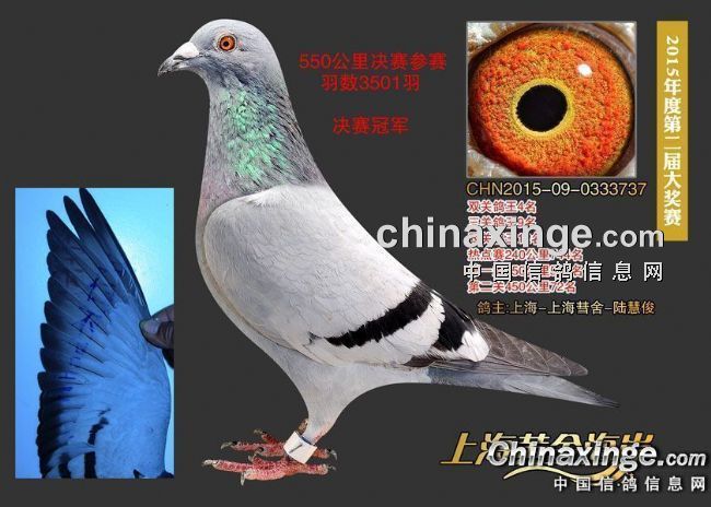 当日,雨后天晴,参赛鸽归巢途中有一段路程逆风,但在大家的祈盼中,下午14时47分,第一批22羽鸽子飞了过来,在公棚上空盘旋一圈就纷纷落棚,紧接着大屏幕显示进棚鸽子信息。冠军被上海彗舍-陆慧俊的一羽环号为2015-09-0333737的灰鸽夺得,分速为