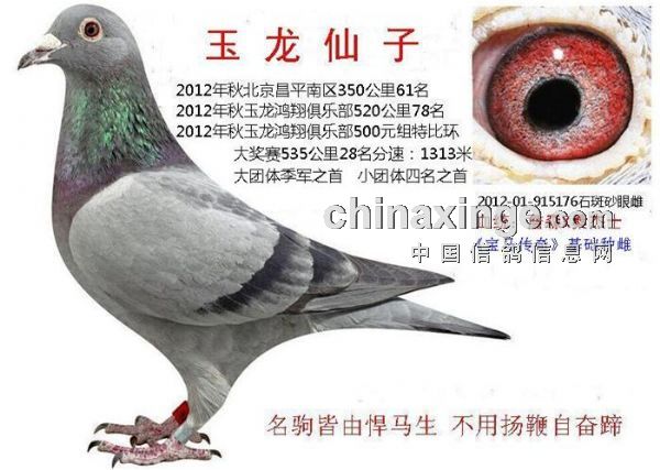 第二配雌“玉龙仙子”,也是一羽赛绩鸽,获得2012年秋北京昌平南区350公里61名,玉龙鸿翔俱乐部520公里普赛78名,500元组特比环大奖赛28名,分速1313米/分。这一配对,共作出三孵5羽幼鸽。第一孵作出两羽幼鸽,家飞丢失一羽幼鸽,另一羽“184”灰砂眼雌鸽获得第一关230公里35名,第二关300公里59名,第三关500公里遭遇“11.19黑色星期四”,于第10天早晨7点30分归巢。
