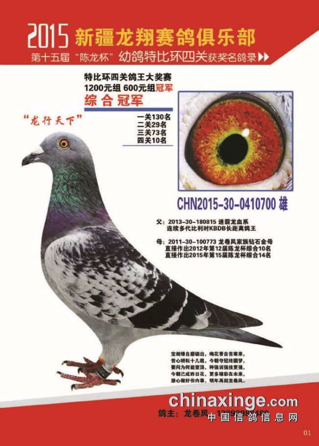 在今年全疆60年大庆的大环境下,比赛延后。新疆的气候是半年夏天半年冬天,四季变化只有两季明显,感受不到四季缓慢的变化,致使俱乐部比赛的大环境不利。在其它鸽会及其它赛事纷纷喊停的情况下,各方都不看好继续比赛。龙翔赛鸽俱乐部顶住所有压力,成功的举办完四关赛,使鸽友血战到底的愿望实现了。鸽友虽说赢少败多,但比赛举办的成功,龙翔赢得了广大鸽友的信任与支持!随着龙翔2016年规程的发布,再一次把龙翔推向新的高度。龙翔也感到了自己的责任和压力,今后龙翔的发展俱乐部将会一如既往地服务于广大鸽友,把压力化作动力。我们深深的知道,没有你们就没有龙翔的今天,再次感谢广大鸽友的鼎力支持,期待鸽友2016飞出辉煌的战绩。