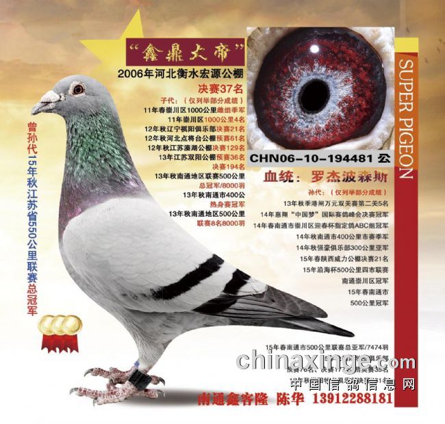 “鑫客隆”陈华育种理念是树立“鑫鼎大帝”这个标杆,采用近亲和回血的手法,始终保持这路鸽子不变形,然后,再引进其它优秀血统鸽,比如有世界大铭鸽芬尼卡5000直子和比利时亚精顿17101羽总冠军子代等,不断地冲进新鲜血液,使其保持活力。另外,含有“鑫鼎大帝”血液的鸽子还必须历经无数赛事锤炼,搏击沙场,能够展现王者归来的才是精英,才能做种延续下一代,以此还创造了“金鼎王子”这路优秀赛鸽。