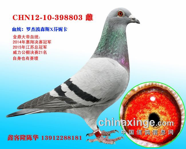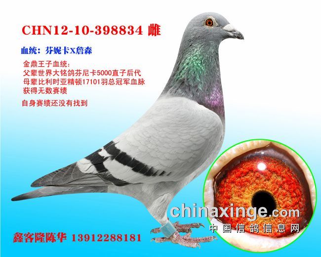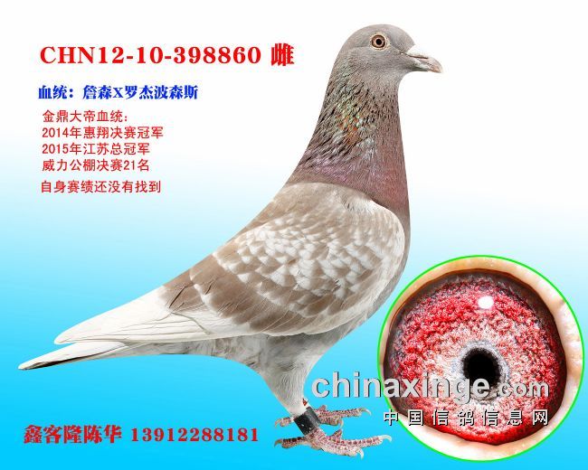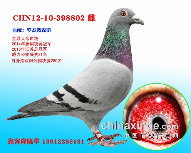 “鑫鼎大帝”这羽赛鸽属罗杰波森斯血统,体型中等,结构匀称,头部宽阔,圆满呈弧圈形,眼皮紧箍眼球,鼻瘤洁白,与额头连接紧密,嘴强壮、坚硬。眼是典型的紫罗兰砂眼,砂面的立体感很强,瞳孔的收放自如,眼中透出一丝丝灵气;脖颈粗壮有力,羽毛在阳光的映衬下,熠熠生辉; 打开口腔,上颚、锯齿形紧闭;羽毛紧薄、柔滑,有极好的绵绒感,抓在手中有一种挣脱感;当你拉开翅膀时,感觉柔软而结实,松手后翅膀收回有力;尾巴是人们所说的要有漂亮的“一字尾”;虽然育种多年,没能展翅蓝天,当你用手指触摸胸肌时,能明显感受到它的爆发力,它的耐翔性、适应性、稳定性和速度快,溶血性强等特点,让“鑫客隆”赛鸽这些年来一直立于潮头,多次夺得多项艰难赛事的桂冠。