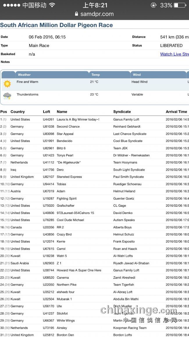 第20届南非百万美元公棚决赛,于当地时间2月6日早6:15放飞,比赛空距541公里。放飞时天气良好,气温21℃,下午出现雷雨天气。
