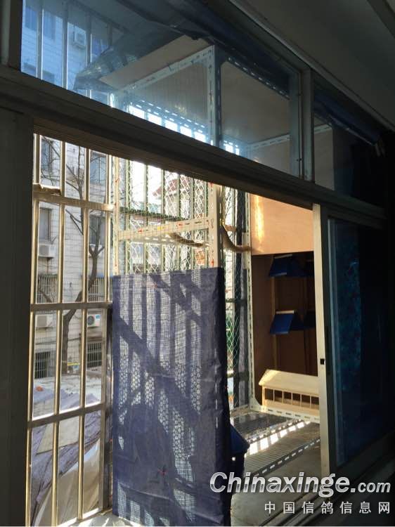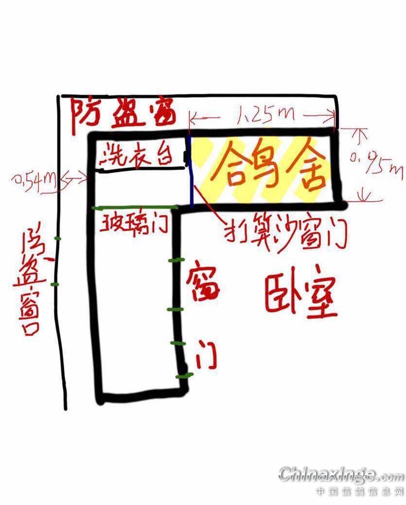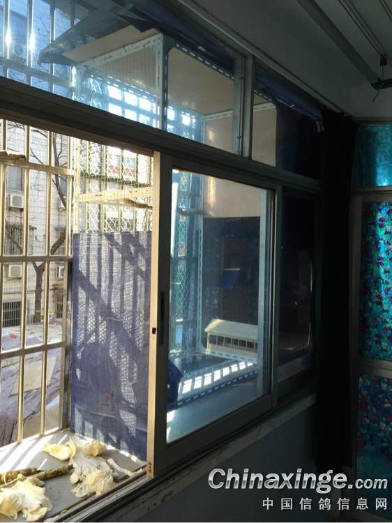 套间养鸽不容易啊,种鸽就养在阳台里面,外面防盗窗当晒笼,飞鹏就直接架在防盗窗上了。图片可能有点乱,不知道能不能看懂,我的阳台是有个90度转角的。
