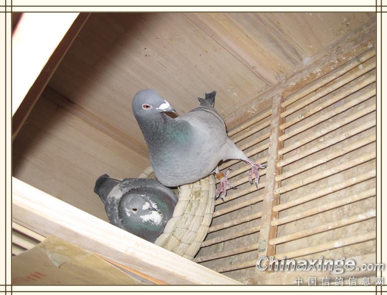 老少配,雄是06年的老盖比,爱咬号血系,虽然年纪较大,但英勇善斗,为抢巢打得满脸血;雌是桑杰士,14年的公棚115名。这一配对去年作出三关鸽王亚军。