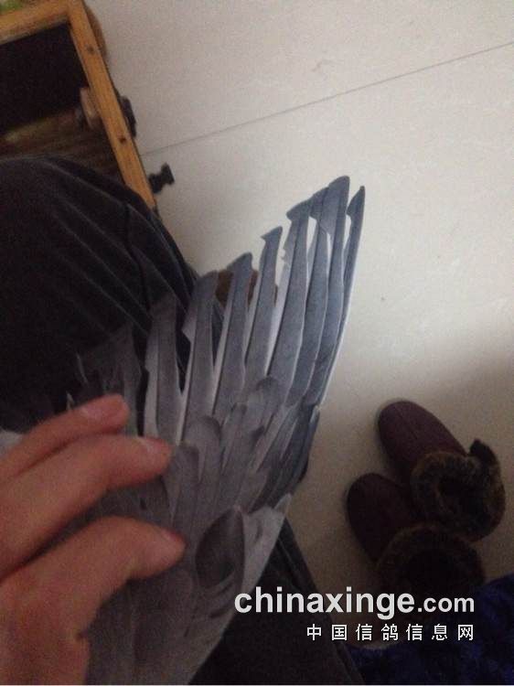 正月初八鸽群家飞,被鞭炮吓得不知道飞哪里去了,当晚查棚发现少羽母鸽。昨晚回来了,翅膀变这样了……这刮条的不专业,再专业点,这鸽子就回不来了!