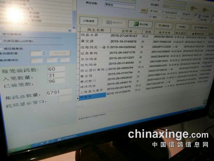 陕西省信鸽协会委派裁判组于2016年3月26日15:50时至3月27日00:30,对陕西飞虹信鸽养殖有限责任公司举办的“2016年第四届(春季)750.8万元+3万元三关赛”进行了第一关比赛集鸽扫描,经逐羽查验扫描核对,共计参赛鸽5791羽,其中更换电子环4羽。