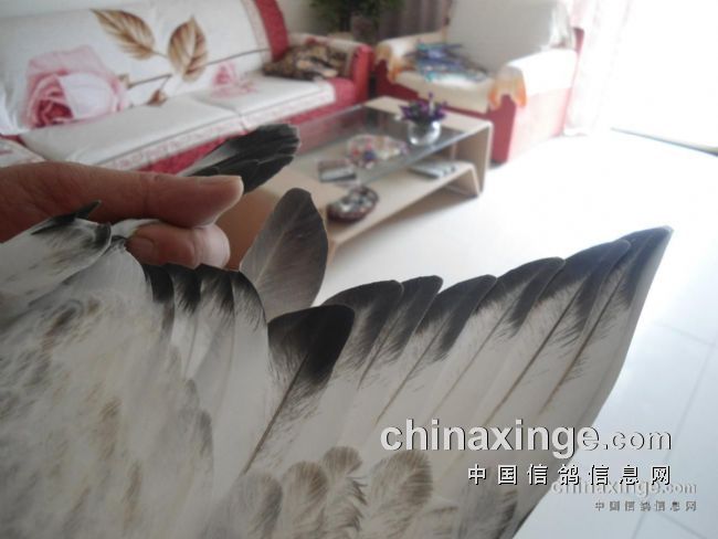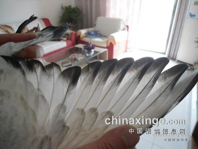今年有一羽同父异母配所出的幼鸽18天时,发现双翅主副羽相连的第一根主羽同时长拧了,几乎转了一圈,羽面朝下,原本朝下的却翻到了正面。因为鸽子长得还不错,就随它去了。今天我突然又想到此事,出于好奇,就将这羽鸽子抓到查看,没有想到的是,第一根主羽已经换羽,而且新长出的主羽完全正常,令人费解。