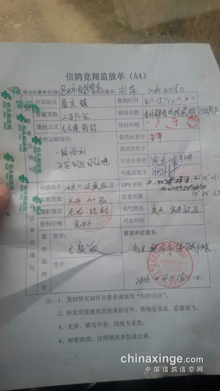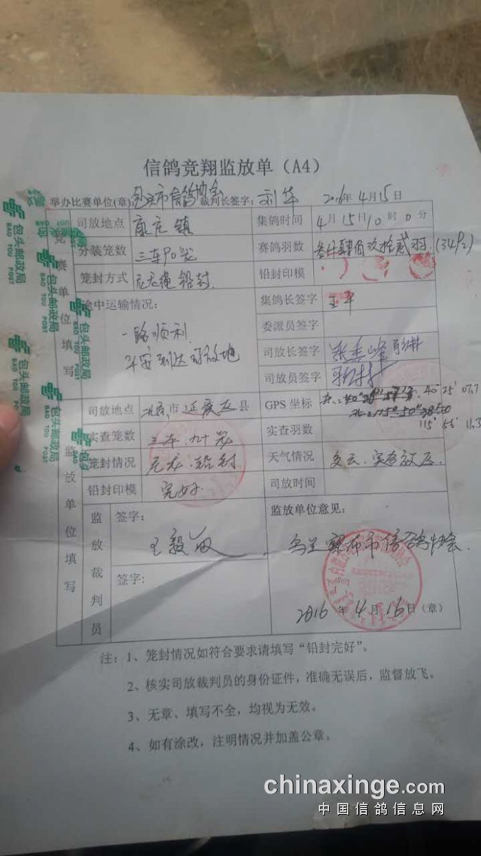 包头市信鸽协会2016年春季500公里于4月16日早上7点40分开笼,经纬度115°56′11.3″,40°25′7.7″,天气多云,适合放飞。本次500公里竞翔由乌兰察布市信鸽协会监放!祝大家飞出好成绩!
