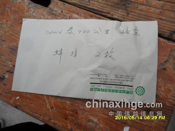 5月14日是安徽省700公里联赛集鸽,我参赛2羽。一羽是2012-12-157239降黄雌,由于没控制好,导致上笼前下了第二个蛋,父亲是铁鸽三项公棚11年刘辉参赛鸽000465六关归巢,母亲是11年台湾鑫业铁鸽三项六关归巢,此鸽本身15秋蚌埠市300公里4000多羽147名。