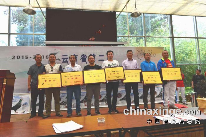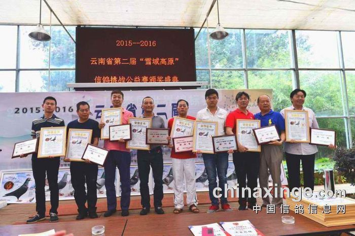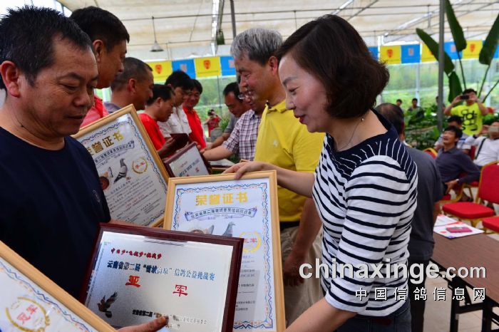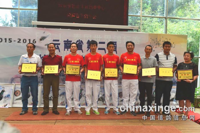 贡献奖(集体)获奖单位:云南博奥司放团队、《春城晚报》社(赛事报到媒体)、丽江市古城区信鸽协会(赛事监放单位)、北京年冠商贸公司、陕西科汇科技公司、西安凯鸽动物药业、昆明天泰彩印包装公司