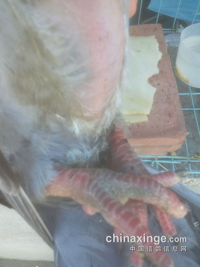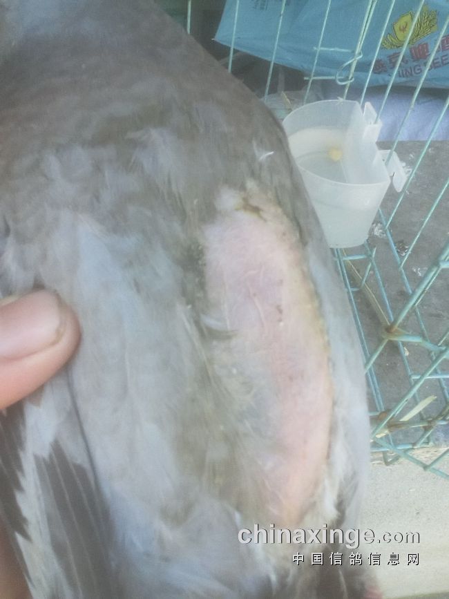我看了棚里没缺鸽子,然后就抓住了它,看见两条腿都折了,胸骨都压弯了,因为腿折了,没法站着,所以只能趴着。拿下后看了这羽鸽子,斑点,看着挺可怜,就给上了点药,给它鸽子料,它只吃玉米,检查没有病。
