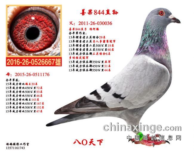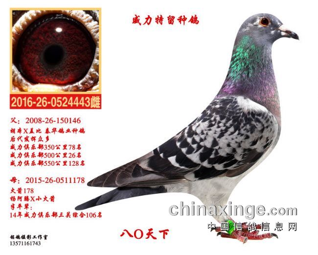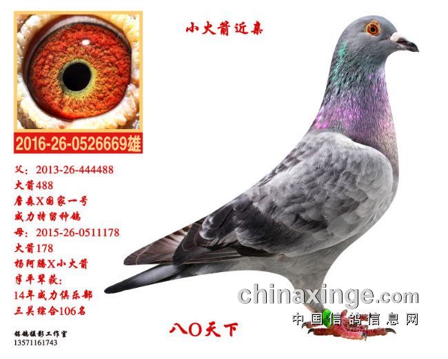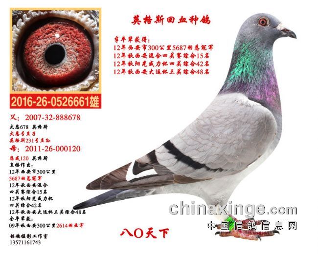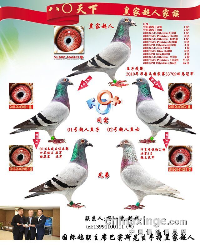 大铭鸽“皇家超人号”就在西安《威力八〇天下》名下,可谓八〇天下就是两位80后,一位是陕西威力公棚总经理杨一波,一位是西安威力俱乐部总经理胡战。我曾经写过《西安威力“八○天下”闪亮登场(图)》《越战越勇“西安八〇天下”(图)》、《西安“八〇天下”单枪匹马战威力(图)》《“西安八〇天下”包揽威力300前三甲》、《西安“八〇天下”三路鸽子称雄(图)》的报道,对他们做过许多叙述。