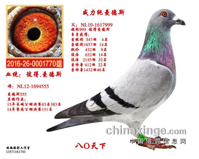 前两天,在中信网有一篇报道《800元赢奖金60多万》,写的是陕西威力“皇家超人”大发威,后代成绩多的不胜枚举,子代、孙代、重孙代,代代发挥,代代出高位,代代赢大奖,是一羽沾血就发挥的超级种鸽、黄金血脉,素有“公棚赢钱系”之称的陕西威力皇家超人血系再发威!在(2016年10月31日)天津市津福公棚的决赛中赢得了800元指定组1692羽亚军的好成绩,共计赢得奖金60多万!因此就有了媒体《800元赢奖金60多万》的热炒。