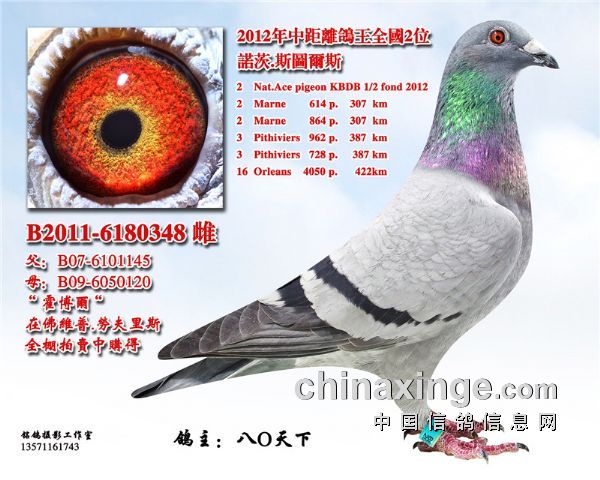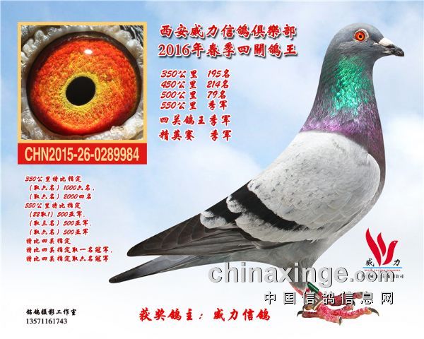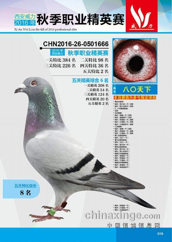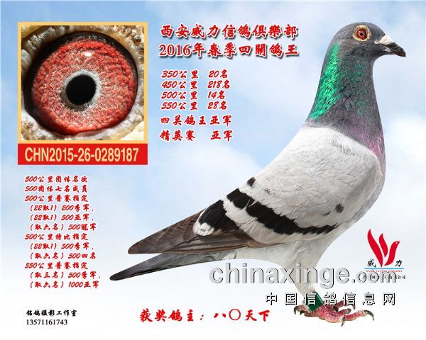 威力八〇天下创造的辉煌赛绩不仅仅是他们拥有好鸽子,关键是他们年轻,具有敢想、敢做、敢创的赛鸽理念。比如他们命名西安威力俱乐部《中国好鸽子五关赛特比环大奖赛》可见对好鸽子的追求。他们认为,好鸽子必须在中国的赛场上飞得好,好赛绩就是好鸽子,一代胜过一代就是好鸽子。养鸽参赛就是一个过程,首先要解决的就是好鸽子的问题。那种赛绩好,遗传基因好,育出子代优秀,又能配各种配偶的就是收藏珍品,多多益善。