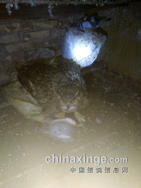 我的鸽子遭殃,被一不明飞禽袭击!26只鸽子还剩七只,一只飞得最好的躺在地上,原因是晚上忘记关跳笼门被这货钻了空子。现已活捉,大家看是猫头鹰吗?有四斤重,气死我了,下面上图!