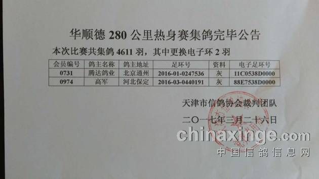 天津华顺德赛鸽公棚春棚280公里热身赛,已于今天早上(03月27日)06时58分在辽宁省绥中县开笼放飞,天气晴,北方1-2级。司放地经纬度:东经120°12′59.4″;北纬40°14′24.0″,实际空距283.5公里。 此次比赛集鸽4611羽,录取前100名,前三名各发奖杯一樽,冠军10000元,亚军6000元,季军4000元,4-100名各1800元。 比赛集鸽放飞图片如下: