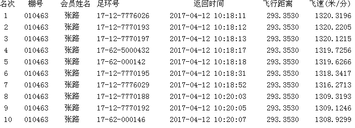 2017年春季300公里预赛飞虹公棚杯汝州比赛前十名成绩:>>更多
