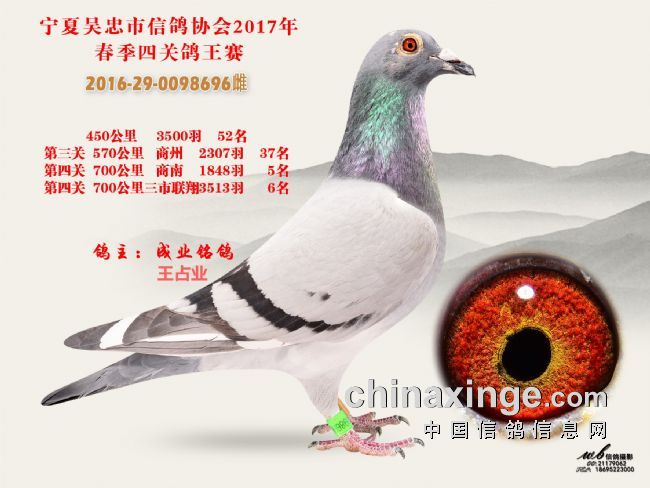 杨勇先后报到两羽鸽子,分别获得吴忠市季军,四名。其中季军,也是三市联翔总季军,环号为16-29-0388819,是一羽非常漂亮的红狐后裔。
