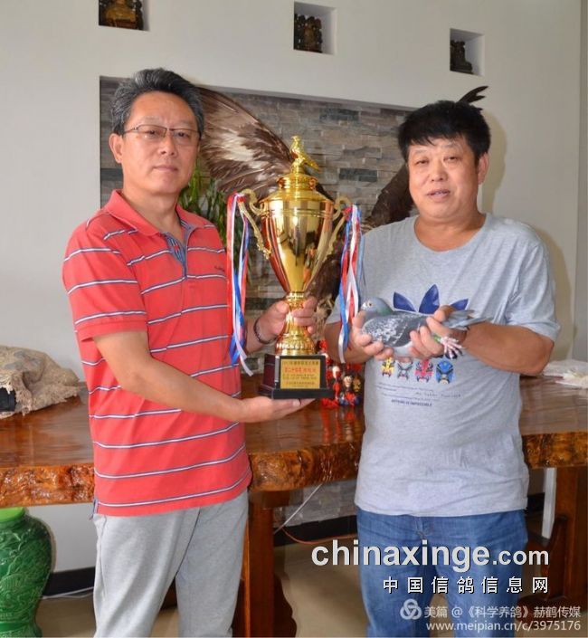 北京朝阳区东坝 鸽友高红光手捧450公里季军与好友王明生手捧双关24名奖杯在一起。