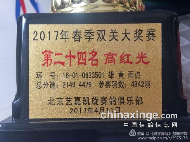中信网北京通讯员,科学养鸽期刊原记者报道:小鸽舍有大作为,高红光先生是一位北京市朝阳区信鸽协会的会员,在北京也是不知名的鸽友,养鸽不过四至五年,没有引进什么大名鸽或名鸽的后裔,仅知道棚内有詹森血统和电脑戈马利血统,更没有什么骄人的成绩。去年笔者陪同某办事处刘主任,到访过高先生的鸽舍,笔者曾说过,明年入赏前10名我一定前来采访,实际上是给予兄弟,打气、加油,更多的是给予鼓励。由于高先生对赛鸽运动的追求和热爱,2017春季赛鸽获得的荣誉让他带回了家。