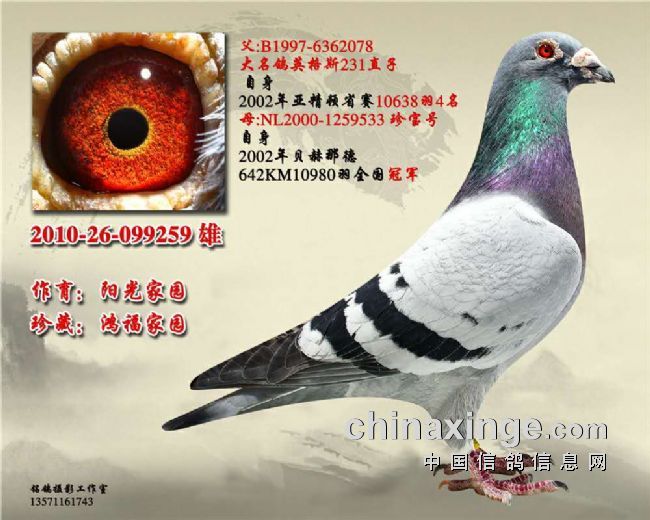 今天随文推出了九羽他们收藏的阳光家园优秀种鸽,以后将陆续推出,主要目的是让鸽界了解西安鸿福家园和鸿福赛鸽俱乐部,相信鸿福俱乐部的实力,携手推进西安赛鸽运动的发展,为西安赛鸽品牌添砖加瓦做贡献。