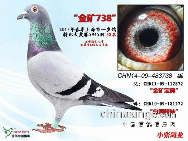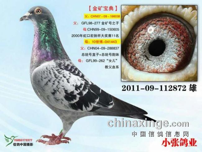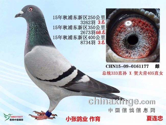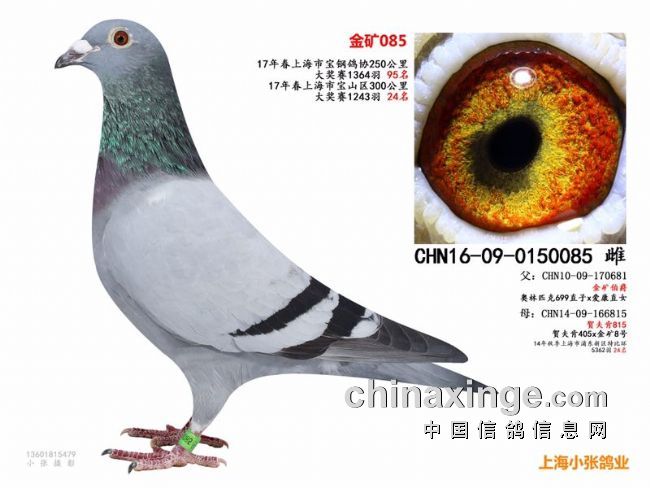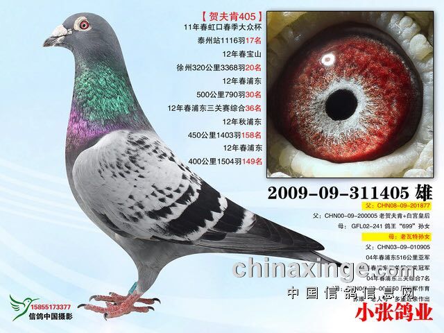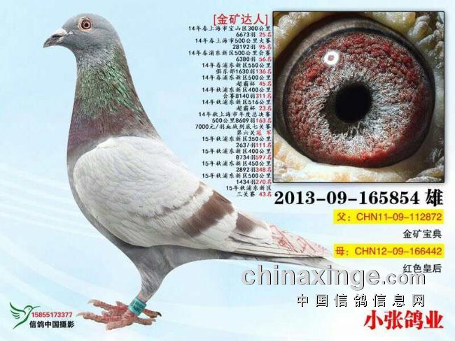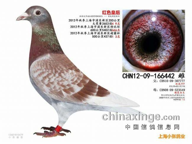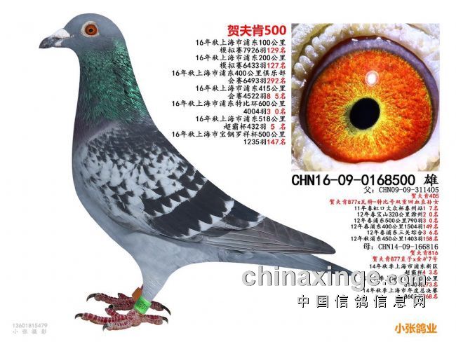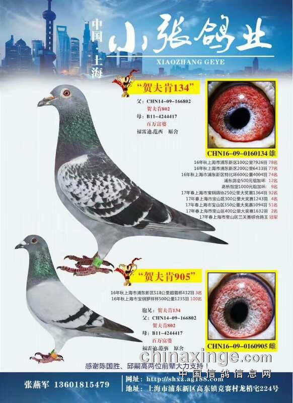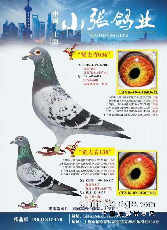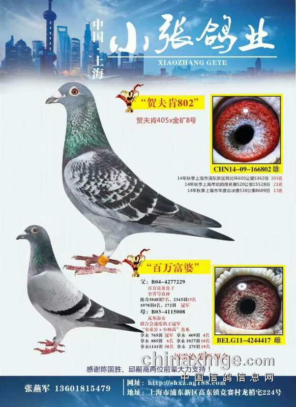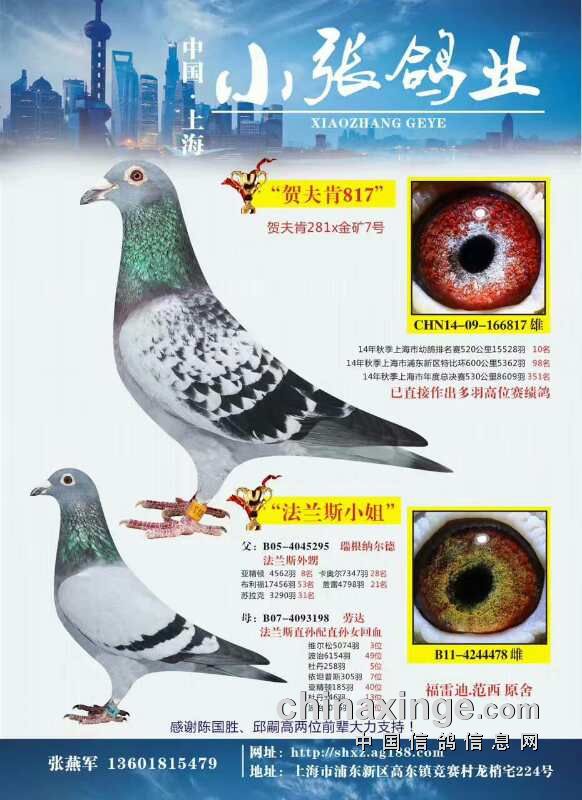 上海小张鸽业——张燕军92年中学毕业开始养鸽并加入鸽会,后因学业中断几年,98年重新起棚。在上海鸽界的前辈邱嗣高先生、陈国胜先生的指教与无偿援助下,99年就获得上海市特比环35名好成绩,之后一发不可收拾,连续多年获市区高位奖。