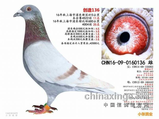 2016年秋上海市信鸽协会530公里年度总决赛5136羽,获:42名、223名。