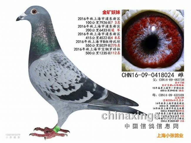 2016年秋上海市浦东鸽协600公里特比环决赛,参赛羽数:4004羽,录取名次:860名,空距:598.436公里,获:19名、25名、30名、74名、164名、398名、697名、770名、822名,多项指定获奖十几万元;