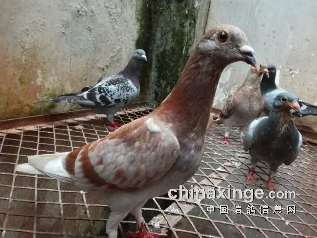 无锡绛——九龙王血统。眼睛棕黄眼,骨架好,羽毛紧,羽色偏红,常有花头白翅出现,尚未使翔,能力待定。第一个是老母,下面三是今年出的鸽子,有一个套得是去年的足环。