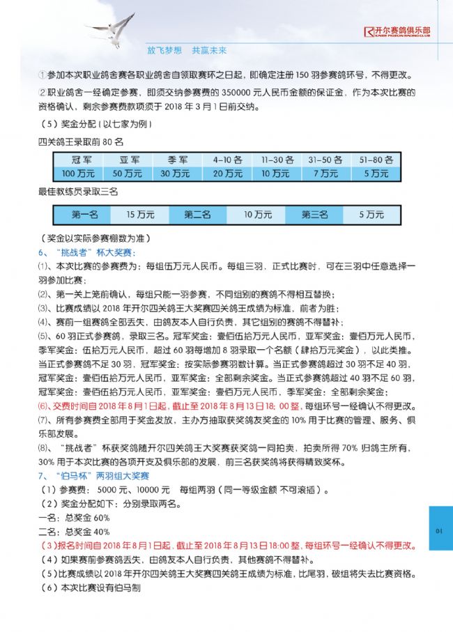 唐山开尔俱乐部2018年“开尔杯”信鸽职业联赛已正式公布竞赛规程,本次比赛设:资格赛、单关赛、鸽王赛、团体赛、职业鸽舍赛、“挑战者”杯大奖赛、“伯马”杯两羽组大奖赛、各项汽车大奖赛、暗指定鸽赛、明指定鸽赛、聚宝盆。其中单关赛共分四关,分别为450公里、500公里、550公里和500公里。售环时间从2018年1月1日开始发售,2018年3月1日截止售环。