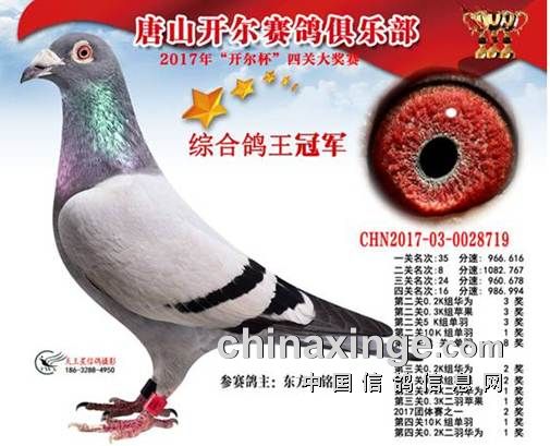 在去年首次举办的唐山四关赛——“开尔杯”四关大奖赛中,唐山本地鸽舍东方一铭的一羽环号0028719的赛鸽,以一关450公里35名、二关500公里8名、三关550公里24名、四关500公里16名,四关均在50名以内的突出赛绩,斩获2017年唐山首届四关赛——“开尔杯”信鸽职业联赛鸽王冠军,同时获得团体亚军。参加2017“开尔杯”职业联赛的鸽友们都知道,去年的四关赛云集了许多国内名家强豪,比赛关关逆风,非常艰难,能在这么大难度的比赛中获得鸽王冠军,彰显其不凡实力。